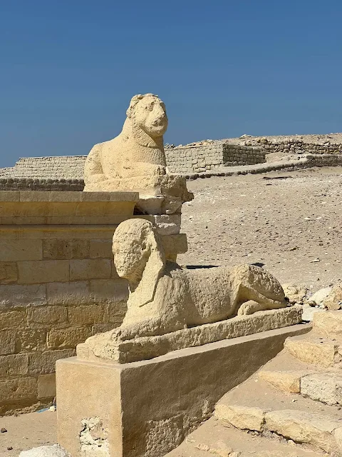 The symmetrical and monumental access from the south, discovered in 2008, starts with a large axial altar (149 x 148cm, 54cm high) in limestone blocks, for holocaust or sacrifice. Northward, along the dromos, two lion statues (1.80m long, on a plinth of blocks) were discovered. Two identical Greek inscriptions are engraved on the base of the twin statues, under the front legs (the gaps in each of the texts can be integrated by the other): "For Queen Cleopatra and King Ptolemy, and Philometor Soter, Protarcos son of Herod, his wife and his children [consecrated the lions] as a votive offering to the goddess Hermouthis the Great".